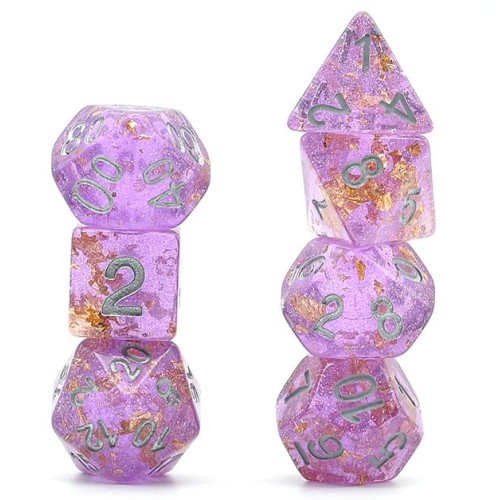 Dobbelstenen Set Gold Foil Shimmer 7 delig. Kunststof, D4 / D6 / D8 / D10 / D10-00 / D12 / D20. Verpakt per 7 stuks assortie in een brick. HOT Games.